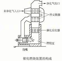 The catalytic combustion device is mainly composed of heat exchangers, combustion chambers, catalytic reactors, heat recovery systems, and exhaust stacks for purifying flue gas, as shown on the right. The purification principle is: before entering the combustion chamber, the unpurified gas is preheated by the heat exchanger and sent to the combustion chamber, and the required reaction temperature is reached in the combustion chamber. The oxidation reaction proceeds in the catalytic reactor. The gas releases part of the heat through the heat exchanger and is discharged into the atmosphere by the chimney.